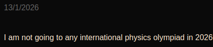 I understand that, without any proper confirmation, my past self had written out an unnecessarily dramatic hook for this site's first blogpost claiming that I won't be going to any international physics olympiad in 2026. This turned out to be wrong and I will, in fact, most likely be going to the 2026 IPhO.